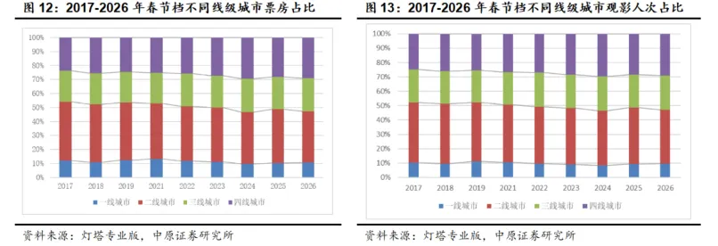 在占比数据方面,2026年春节档一线城市至四线城市票房占比分别为10.62%、36.74%、23.63%、29.02%,同比分别变动0.50pct、-1.78pct、0.39pct、0.90pct;观影人次占比分别为9.60%、37.60%、23.60%、29.20%,同比分别变动0.39pct、-1.85pct、0.58pct、0.88pct。
