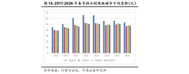 一线城市至四线城市含服务费的平均票价分别为52.95元、46.74元、47.90元、47.55元,同比分别下滑5.25%、5.77%、6.63%、5.77%。