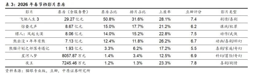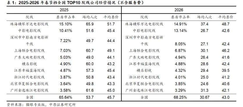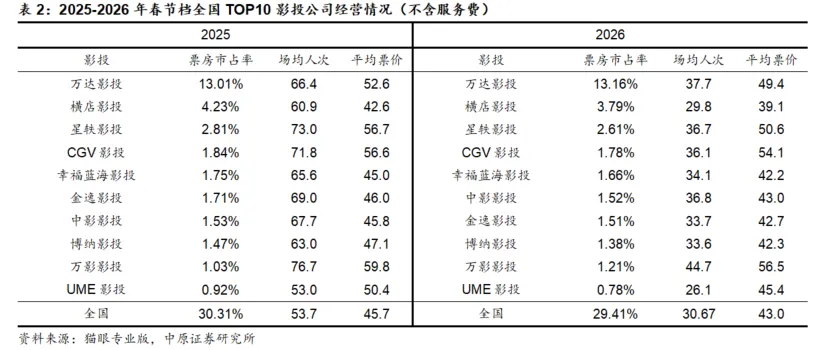 院线端,根据猫眼专业版数据,2026年春节档TOP10院线的合计市占率68.25%,同比提升2.61pct,其中万达电影院线票房市场占有率14.91%,同比下滑0.19pct;中影电影院线票房占有率13.14%,排名第二,同比提升2.73pct;深圳市中影南方电影新干线票房占有率8.05%,排名第三,同比提升0.83pct。