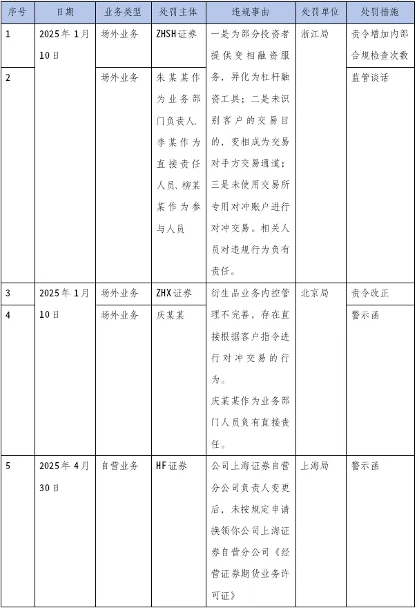 从处罚主体看,主要为证监会各地方局的罚单,其中浙江局4张、北京局2张、上海局2张、四川局1张。2025年,未见证监会机构部、中证协、交易商协会开具罚单。