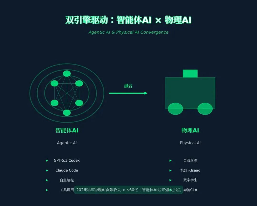 •智能体AI(Agentic AI):过去数月迎来爆发拐点(GPT-5.3 Codex、Claude Code等),能自主执行复杂任务,带来指数级推理代币需求;