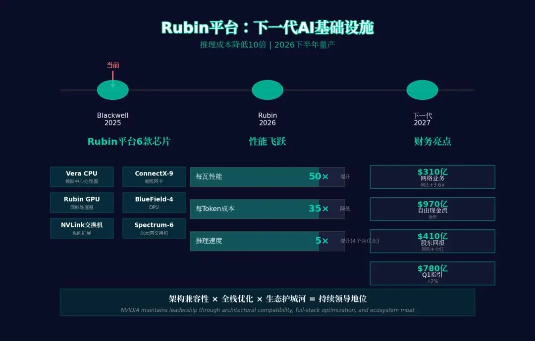 •Rubin平台:2026年下半年量产,含6款新芯片(Vera CPU、Rubin GPU等),推理成本再降10倍;