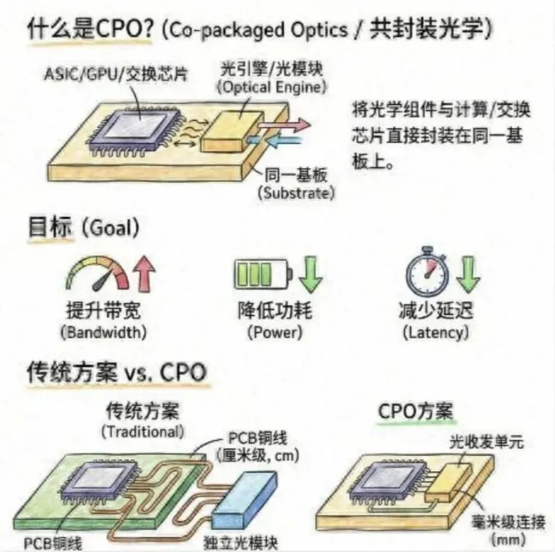 CPO——共封装光学技术由此回到了C位。简单理解,这是在数据高速公路上开辟了光速“快车道”:将光模块直接与算力核心芯片通过三维封装绑定,电信号在手机壳厚度范围内传递,稍远点、几十米甚至上千米的距离全交由光信号来搞定。这样一来,信号损耗、能耗和延迟均大幅下降,带宽提升到传统方案的3倍,空间成本也随之降低一半。CPO不仅节能,而且抗失效能力强,对于超大规模数据中心和AI集群成了优选方案。