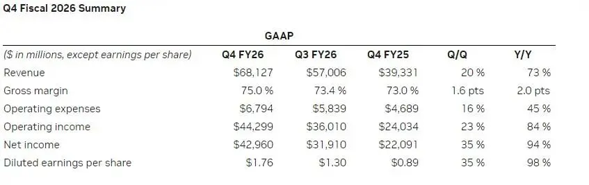 当季度营收创下纪录,达681亿美元,环比增长20%,同比增长73%。净利润429.6亿美元,同比增长超90%,摊薄后每股收益1.76美元。2026财年全年营收为2159亿美元,同比增长65%。毛利率71.1%,净利润1200.67亿美元,摊薄后每股收益4.90美元。