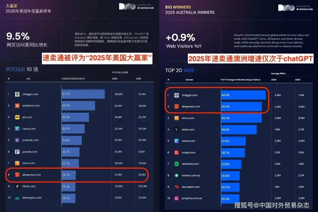 近日,互联网数据分析机构Similarweb发布2026年度Digital 100报告。阿里旗下跨境电商平台速卖通AliExpress在美国、英国、德国、澳洲等多个发达国家市场均跻身综合平台增速前10。差异化的品牌策略和坚定的本地化投入,成为其在高竞争、高门槛市场持续增长的关键优势。