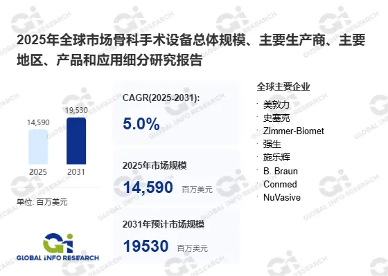 全球骨科手术设备市场正沿着一条坚实且可预期的增长曲线稳步前行。据GIR (Global Info Research)调研数据显示,按收入计,2024年全球该领域市场规模约为13950百万美元。随着全球人口老龄化加剧及运动损伤频发,骨科手术需求量持续攀升,推动市场不断扩容,预计到2031年,这一数字将达到19530百万美元。在2025至2031年期间,市场年复合增长率(CAGR)预计为5.0%。这一温和而坚定的增速,反映出行业已进入成熟发展期,在技术迭代与手术量增长的双重驱动下,正展现出强大的抗周期韧性与长期投资价值。