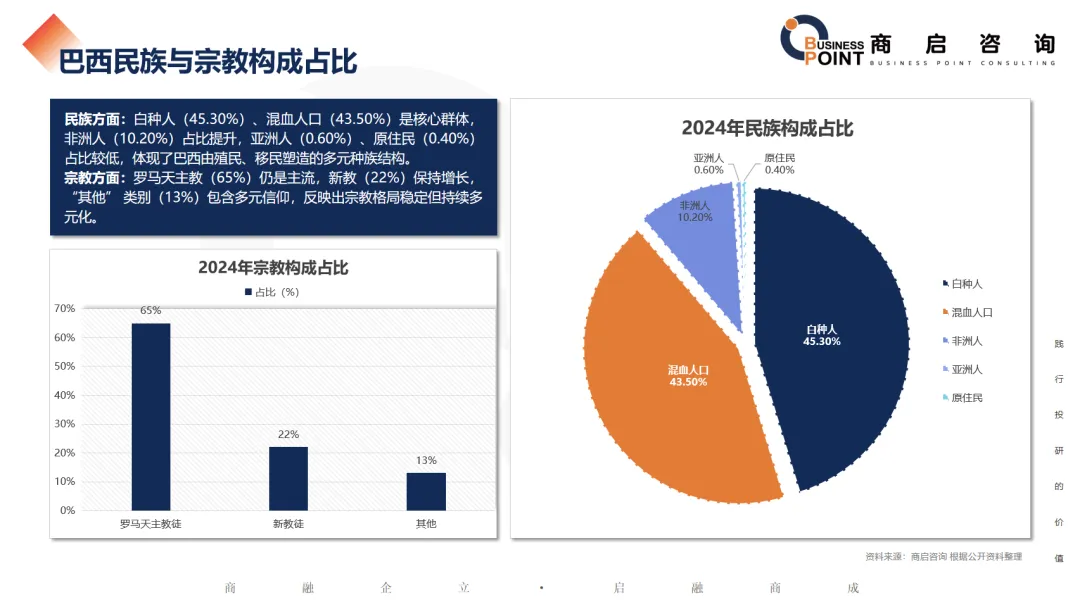 民族方面:白种人(45.30%)、混血人口(43.50%)是核心群体,非洲人(10.20%)占比提升,亚洲人(0.60%)、原住民(0.40%)占比较低,体现了巴西由殖民、移民塑造的多元种族结构。