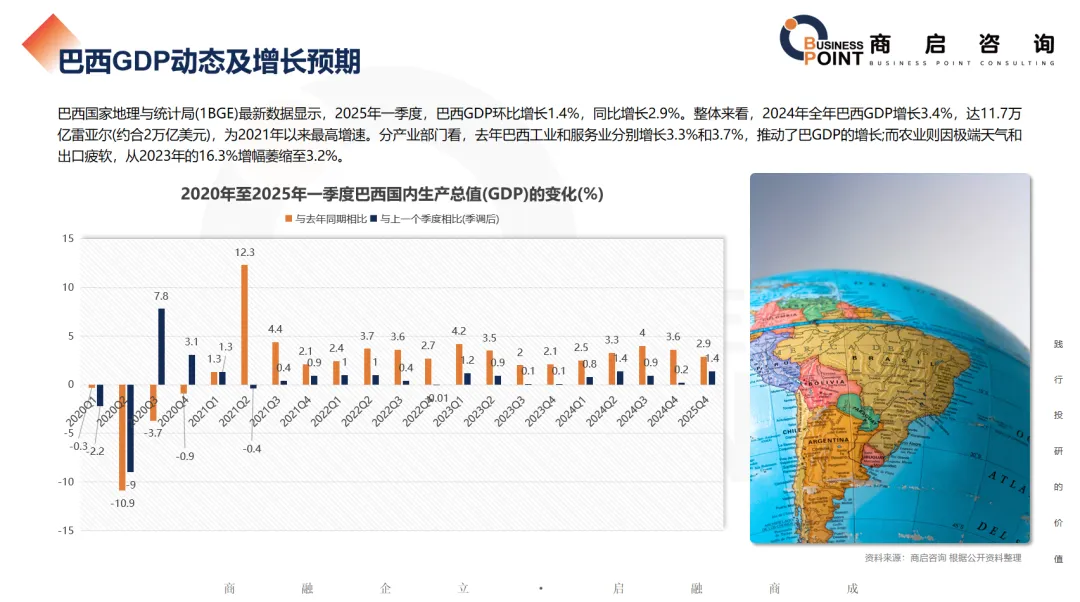 巴西国家地理与统计局(1BGE)最新数据显示,2025年一季度,巴西GDP环比增长1.4%,同比增长2.9%。整体来看,2024年全年巴西GDP增长3.4%,达11.7万亿雷亚尔(约合2万亿美元),为2021年以来最高增速。分产业部门看,去年巴西工业和服务业分别增长3.3%和3.7%,推动了巴GDP的增长;而农业则因极端天气和出口疲软,从2023年的16.3%增幅萎缩至3.2%。