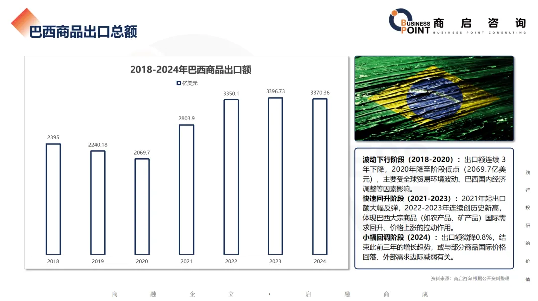 快速回升阶段(2021-2023):2021年起出口额大幅反弹,2022-2023年连续创历史新高,体现巴西大宗商品(如农产品、矿产品)国际需求回升、价格上涨的拉动作用。