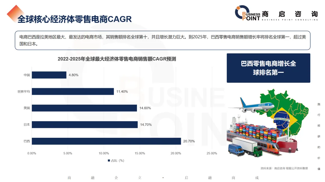 电商巴西是拉美地区最大、最发达的电商市场,其销售额排名全球第十,并且增长潜力巨大。到2025年,巴西零售电商销售额增长率将排名全球第一,超过美国和日本。