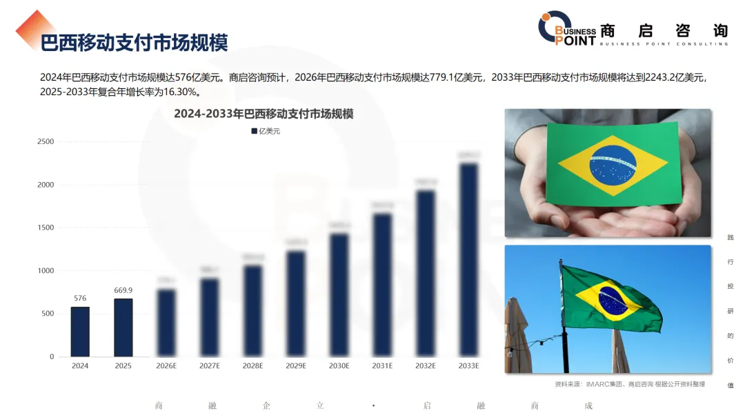 2024年巴西移动支付市场规模达576亿美元。商启咨询预计,2026年巴西移动支付市场规模达779.1亿美元,2033年巴西移动支付市场规模将达到2243.2亿美元,2025-2033年复合年增长率为16.30%。