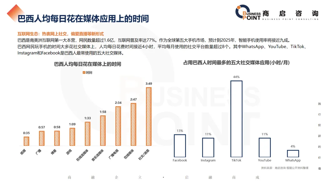 巴西网民玩手机的时间大多花社交媒体上,人均每日花费时间接近4小时,平均每月使用的社交平台数量超过8个。其中WhatsApp、YouTube、TikTok、Instagram和Facebook是巴西人最常使用的五大社交媒体。