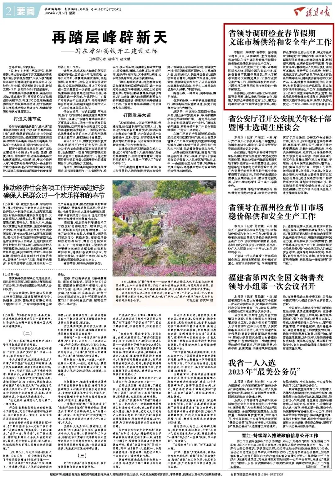 张彦指出,在辞旧迎新之际营造浓厚节日氛围,是弘扬优秀传统文化、增强人民群众幸福感的应有之义。要充分利用我省“福”文化传承创新成果,用好群众喜闻乐见的文化元素,将龙年生肖IP“福瑞龙”和“福暖四季 福泽绵长”主题海报等自然融入新春环境布置,烘托福气满满、充满希望的春节氛围,传递浓浓年味。着眼满足人民群众美好生活更高追求,提升节日文化供给,创新文化表达方式,办好“闽派”特色艺术作品系列展等活动,提供更多新形态的文化产品,以高质量文化赋能现代闽式生活。时刻紧绷安全生产这根弦,扎实做好岁末年初安全生产工作,加强旅游景区、公共文化空间等场所安全监管,强化隐患排查和重点领域整治,确保春节期间文旅市场安全有序,保障人民群众度过一个欢乐、祥和、平安的新春佳节。