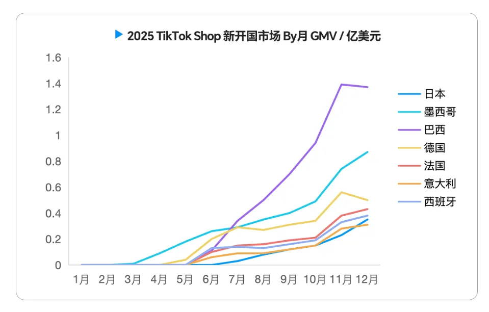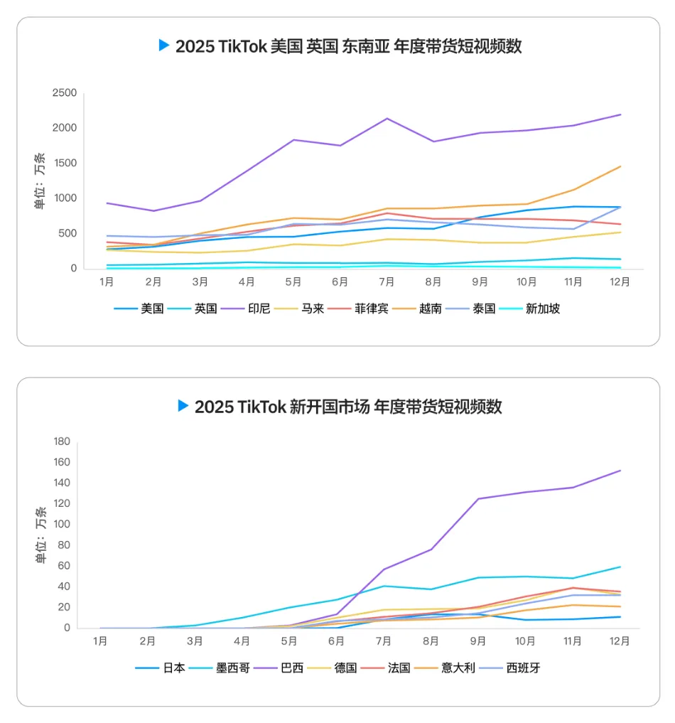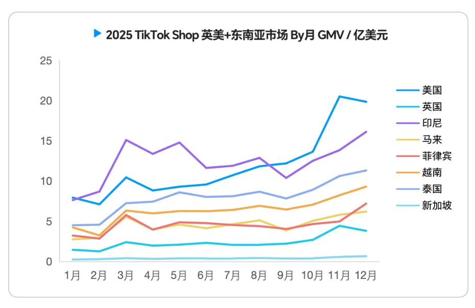 从全年走势看,欧美市场在 TikTok 首个全球“黑五”大促带动下,于 Q4 出现集中放量;东南亚保持全年稳步增长;新上线站点在完成冷启动后,放量节奏与年末消费周期高度相关。规模扩张已经完成,结构分化正在形成。