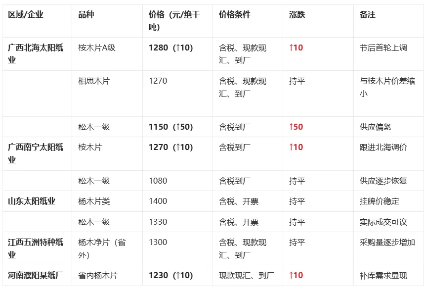 南方领涨:广西北海、南宁桉木片同步上调10元,北海松木一级上调50元显示补库需求集中。