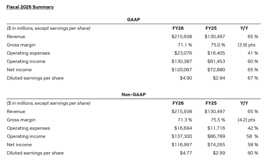 NVIDIA公布2026财年第四季度及全财年财务报告,季度营收达创纪录的681.3亿美元,同比增长73%,超出市场预期;全年营收为2159.4亿美元,增长65%。核心数据中心业务季度营收同比增长75%至623亿美元。公司对2027财年第一季度营收预期为780亿美元(上下浮动2%),远超市场预期。