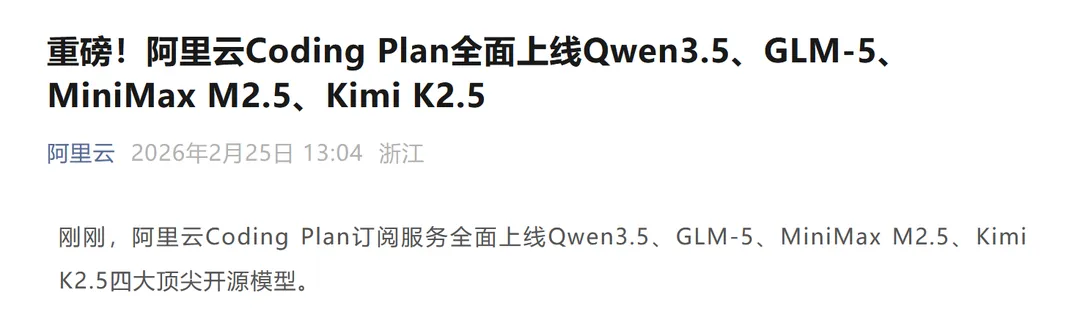阿里云百炼Coding Plan 近期上线了 Qwen3.5、GLM-5、Kimi K2.5 等多款顶尖开源模型及编程专用模型。