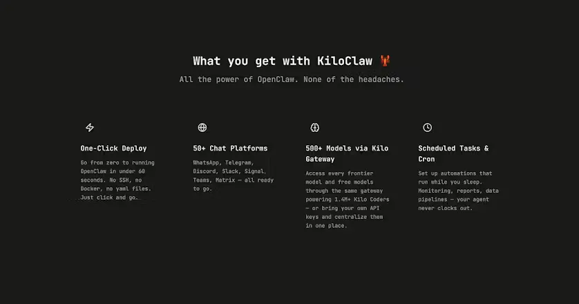 Kilocode 近日宣布推出全托管云端版 OpenClaw——KiloClaw。该产品原生连接 Kilo Gateway,支持访问超 500 个模型。官方表示,平台负责基础设施与安全监控,用户无需配置 SSH 或 Mac Mini 即可免费运行。