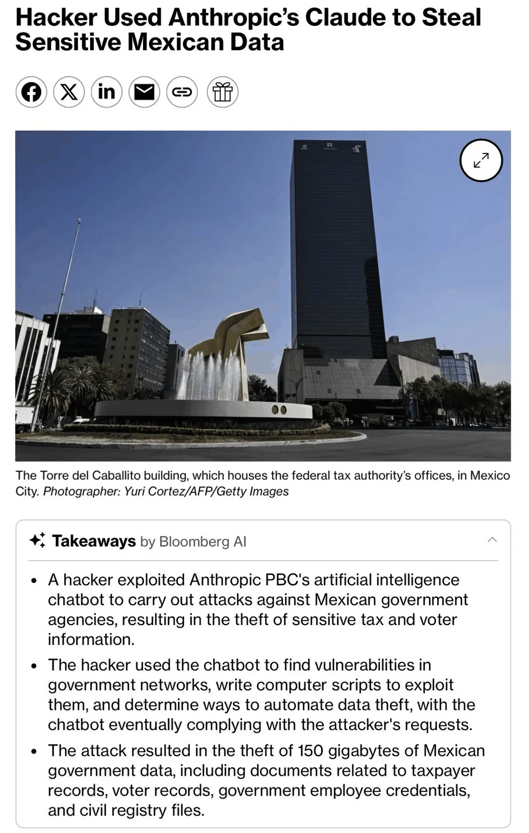 Claude分析漏洞,攻击了墨西哥政府机构,导致约 150GB 的税务和选民数据失窃。