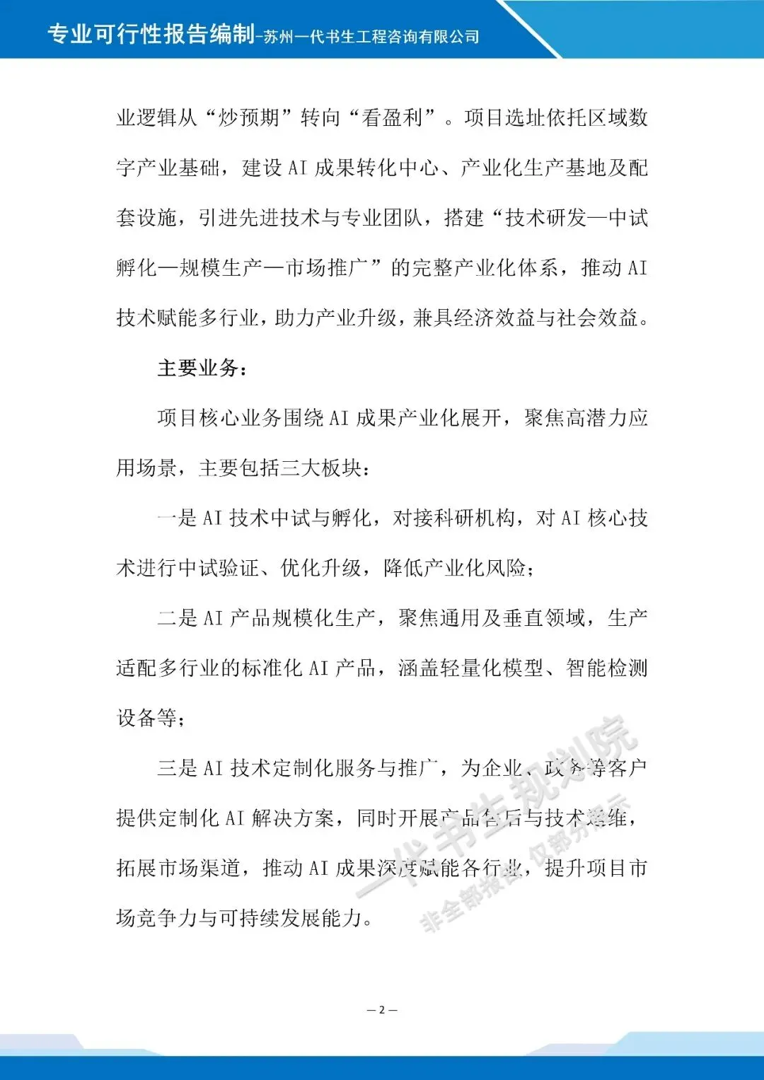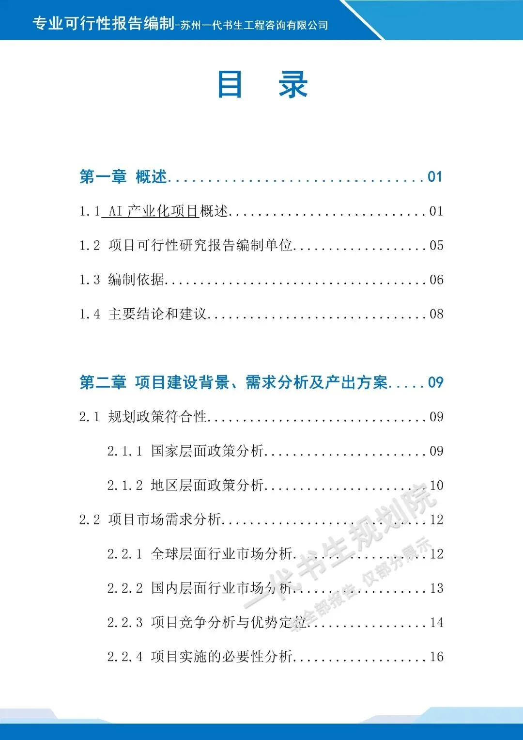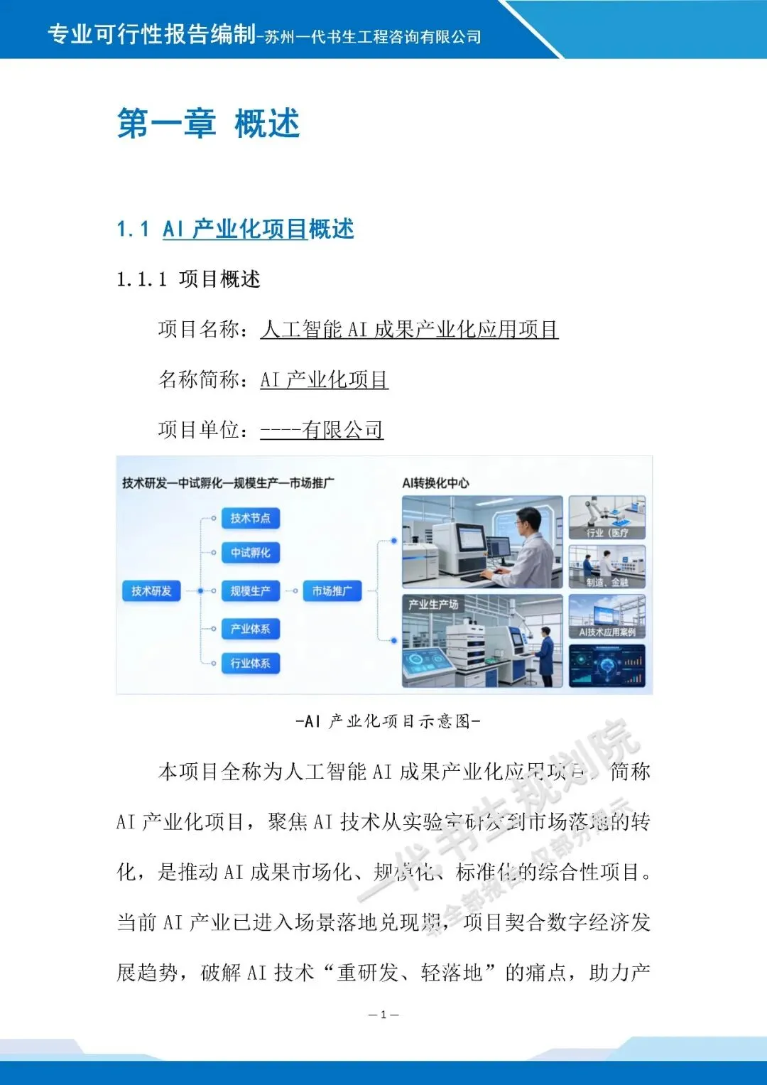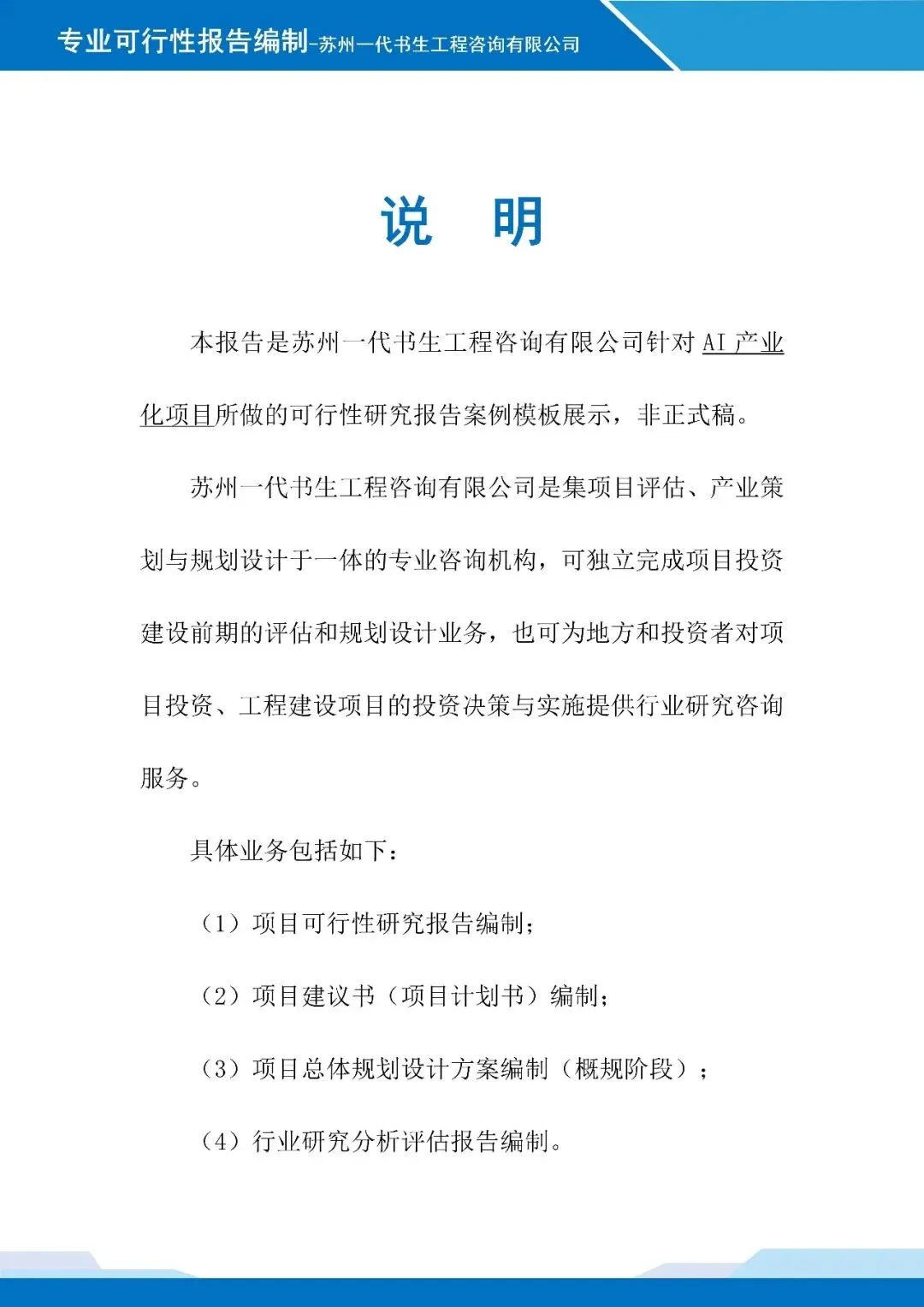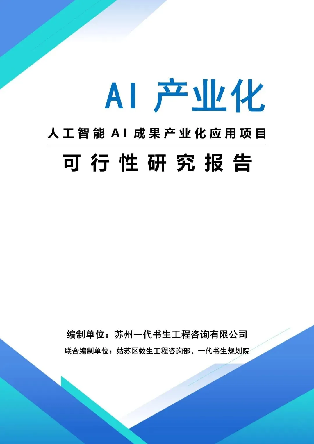 《人工智能AI成果产业化应用项目可行性研究报告》是由苏州一代书生工程咨询有限公司编制,该报告严格遵循国家发改委发布的可行性研究报告编写大纲要求,立足当前AI产业“算力普惠化、场景纵深化”的发展新阶段,聚焦AI成果从技术研发向产业落地的转化核心,为项目投资、立项、实施提供全面、严谨、专业的可行性研判。作为深耕工程咨询领域多年的专业机构,苏州一代书生依托资深调研团队、完善的数据分析体系及丰富的项目实操经验,全面整合AI行业一手数据、产业政策及技术前沿动态,深度拆解AI成果产业化的核心逻辑与实施路径。