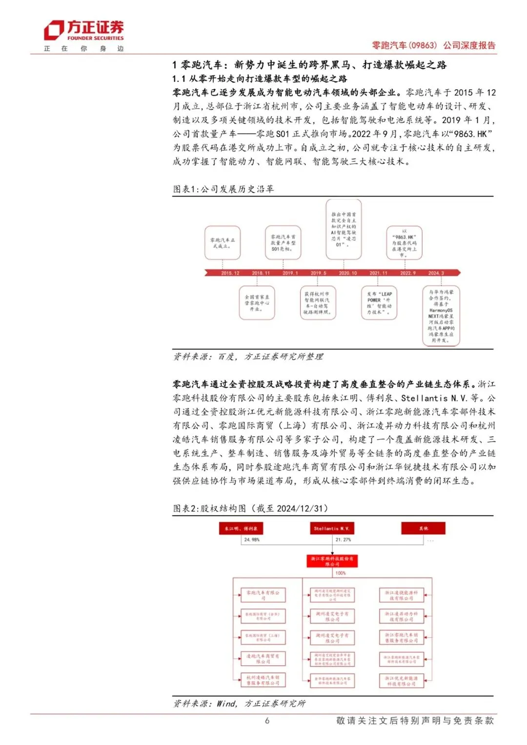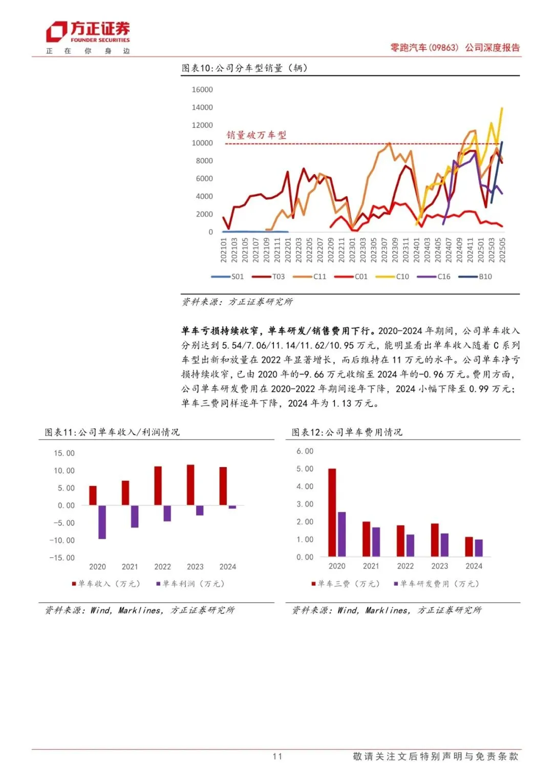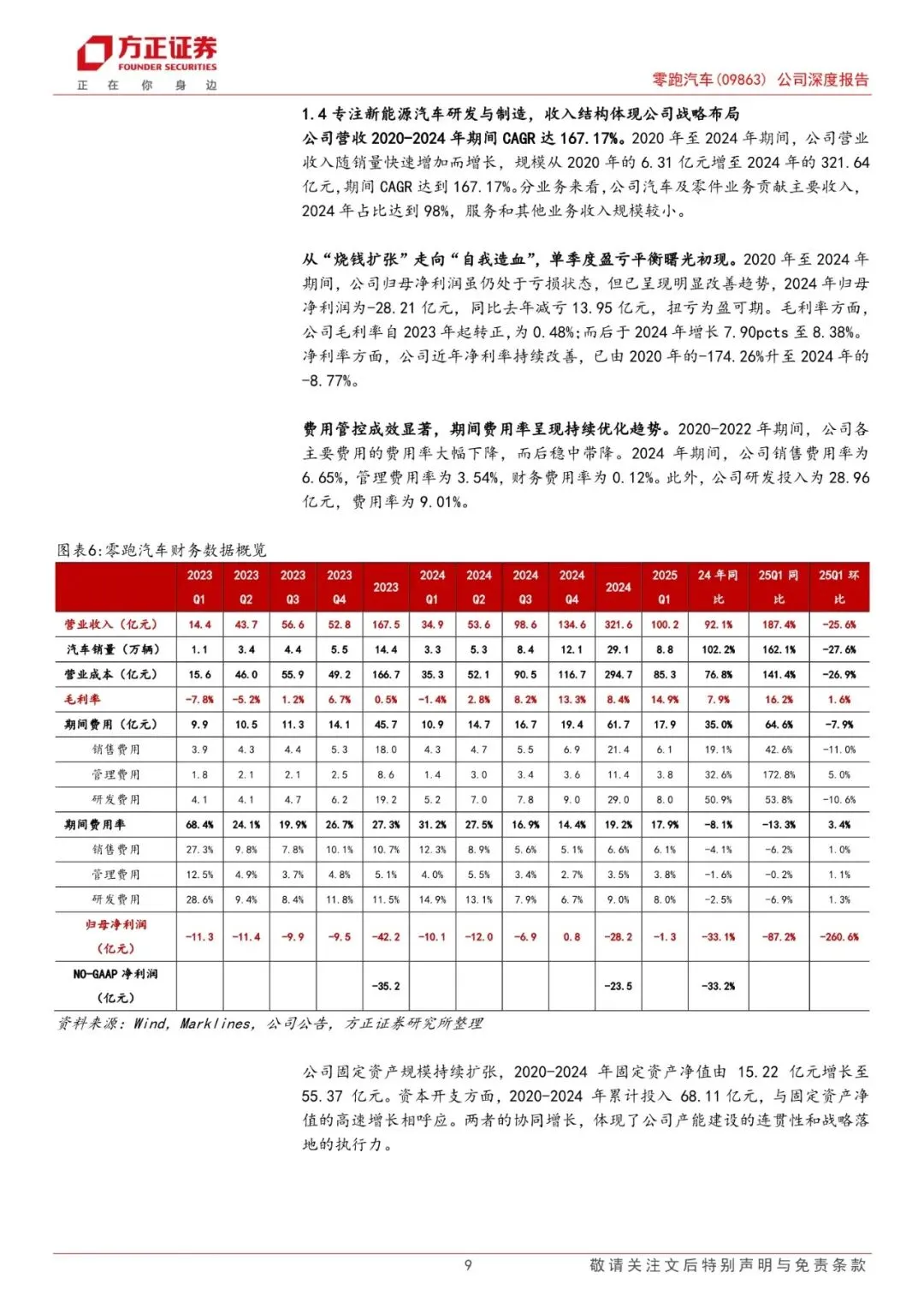 零跑汽车于2015年12月成立,公司主要业务是汽车产销。2024年期间,公司营业收入随销量快速增加而增长,规模从2020年的6.31亿元增至2024年的321.64亿元,期间CAGR 达到167.17%。2024年公司归母净利润为-28.21亿元,虽仍处于亏损状态,但已呈现明显改善趋势。2021-2024年期间,公司分别实现销量4.4/11.1/14.4/29.3万辆,对应单车ASP7.06/11.14/11.62/10.95万元。