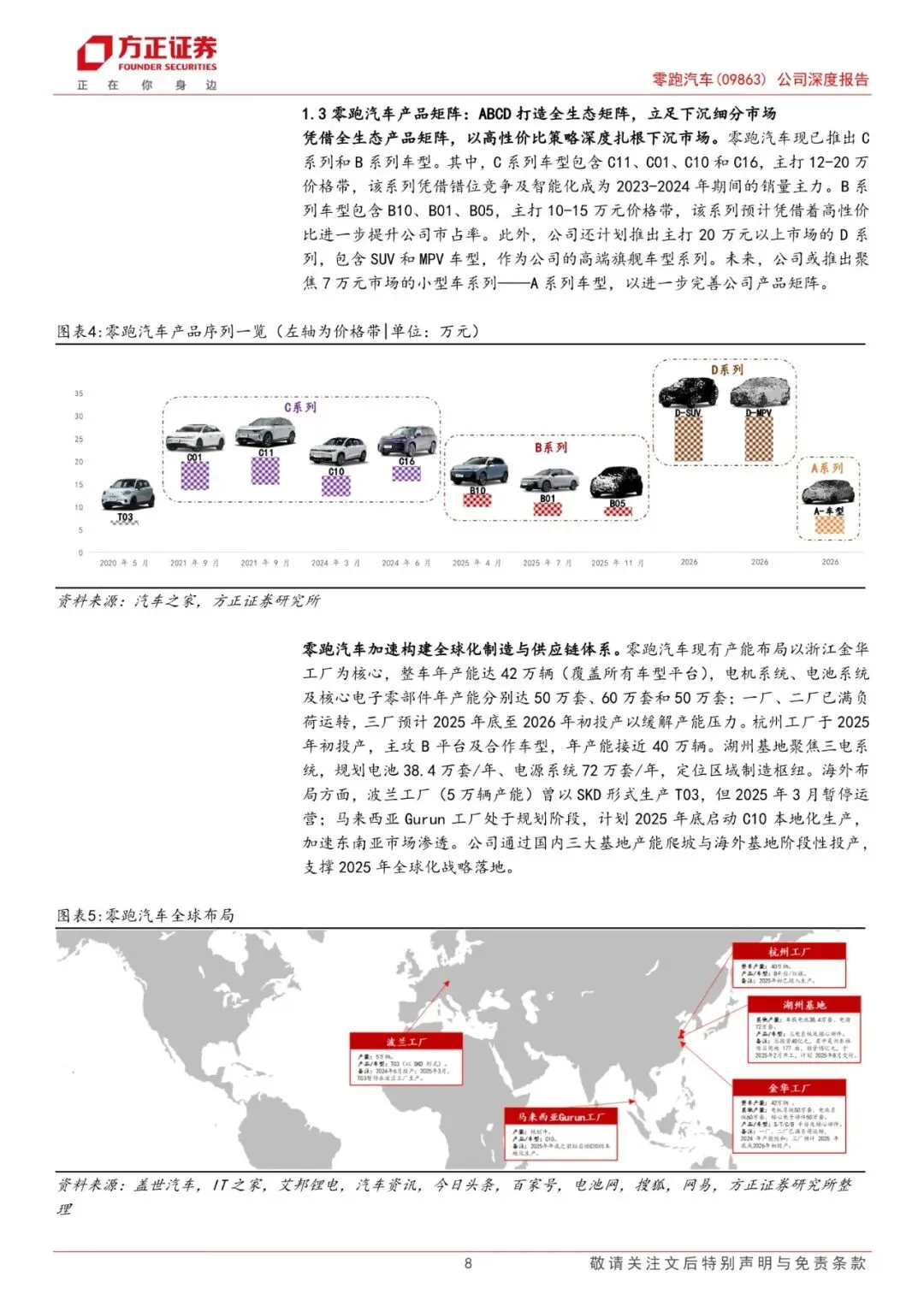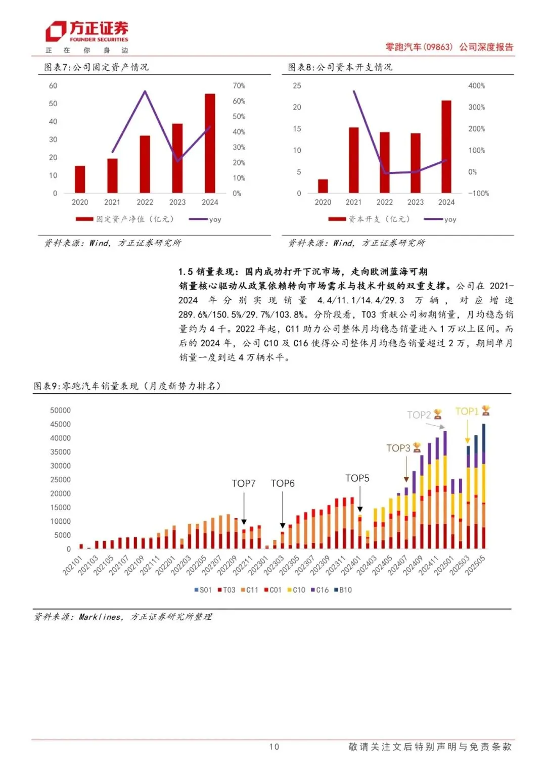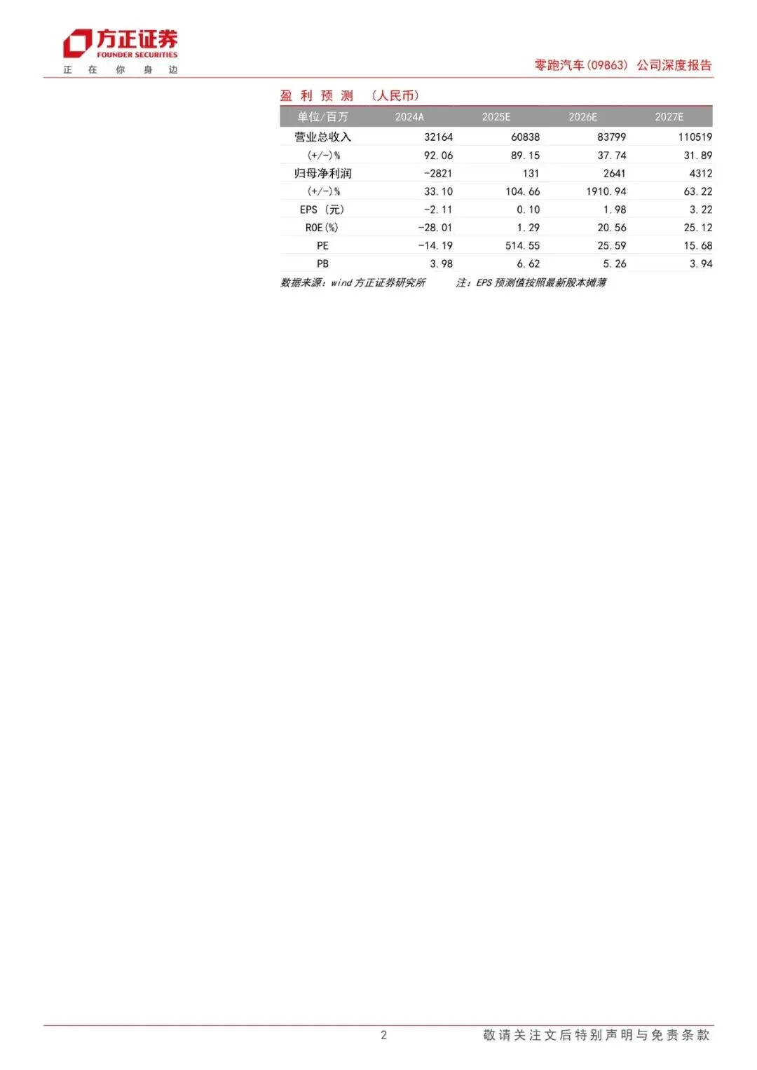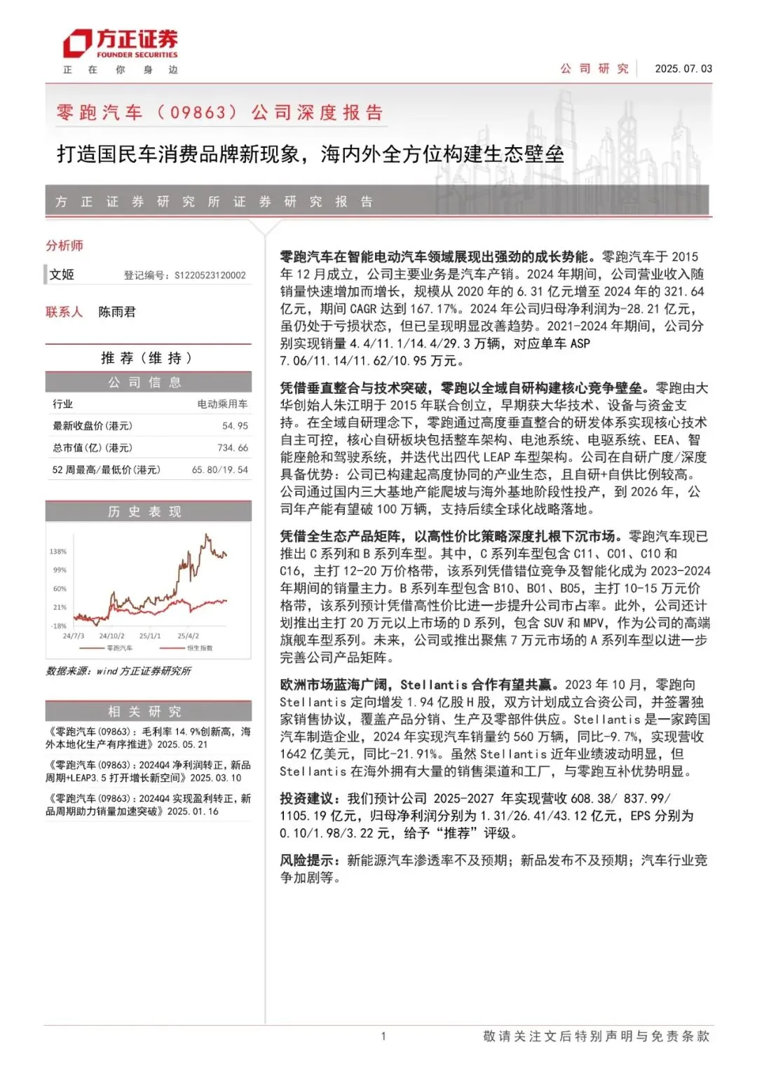零跑汽车于2015年12月成立,公司主要业务是汽车产销。2024年期间,公司营业收入随销量快速增加而增长,规模从2020年的6.31亿元增至2024年的321.64亿元,期间CAGR 达到167.17%。2024年公司归母净利润为-28.21亿元,虽仍处于亏损状态,但已呈现明显改善趋势。2021-2024年期间,公司分别实现销量4.4/11.1/14.4/29.3万辆,对应单车ASP7.06/11.14/11.62/10.95万元。
