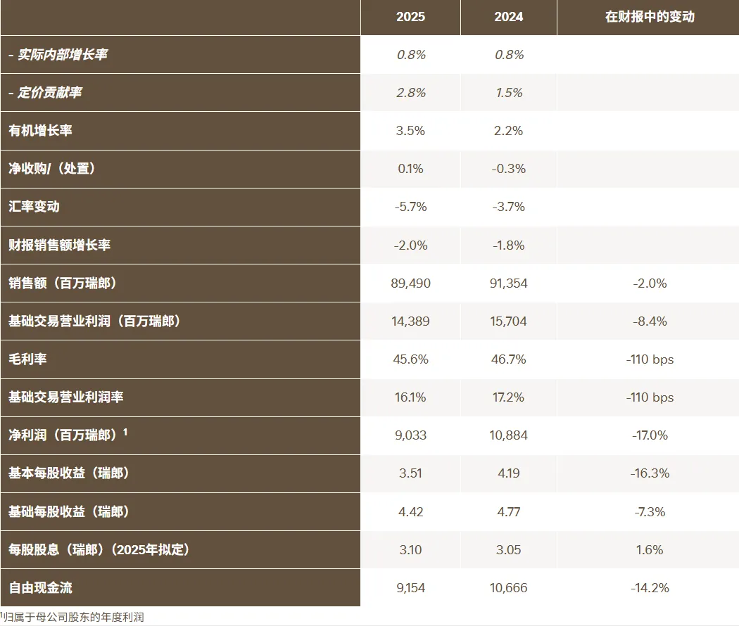 2025年雀巢集团总营收达到 894.90 亿瑞士法郎,折合人民币约 7740 亿元,同比下降 2%;净利润为 90.33 亿瑞士法郎,同比降幅达 17%,整体经营数据呈现下滑态势。不过在看似低迷的业绩背后,仍有核心指标展现出韧性,集团实现了 16.1% 的基础交易营业利润率,还创造了 92 亿瑞士法郎的自由现金流,为业务调整和战略推进奠定了财务基础。
