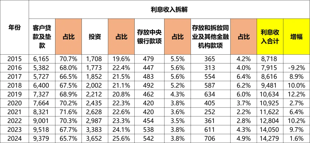 其中大头是客户贷款及垫款利息收入,2015~2024年期间占比介于65.7%~71.6%之间,最近几年呈现下跌趋势,从2021年的71.6%逐年下降到2024年的65.7%。