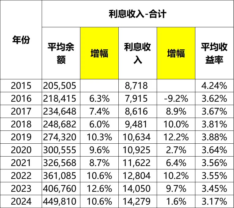 平均余额方面,从2015年的20.55万亿,增长到2024年的44.98万亿,累计增幅119%,年化增幅9.1%,2022~2024年增幅分别为10.6%、12.6%、10.6%,均为两位数的增长。