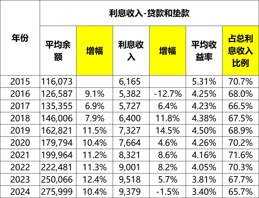 从平均余额来看,从2015年的11.61万亿,增长到2024年的27.60万亿,十年累计增幅138%,年化增幅10.1%,2022~2024年增幅分别为11.3%、12.4%、10.4%,均为两位数增长。