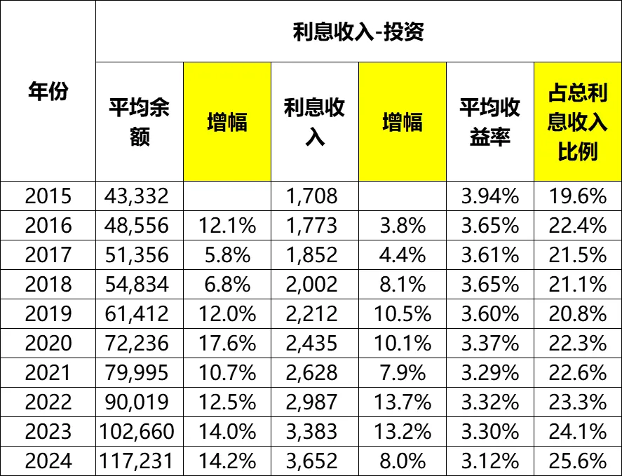 投资利息收入金额从2015年的1708亿,增长到2024年的3652亿,累计增幅114%,年化增幅8.8%,其中2022~2024年增幅分别为13.7%、13.3%、8.0%。