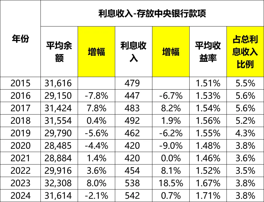 存放央行款项的利息收入,十年来几乎没什么变化,从2015年的479亿略为增加到2024年的542亿。占比这从2015年的5.5%波动下降到2024年的3.8%。