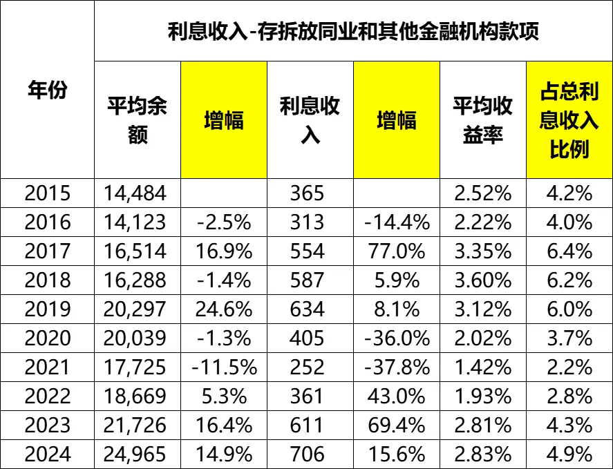 同业利息收入金额从2015年的365亿,增长到2024年的706亿,累计增幅93%,年化增幅7.6%,2022~2024年增幅分别为43.3%、69.3%、15.5%。最近三年增幅很高,但是毕竟占比小,对整体贡献增量有限。