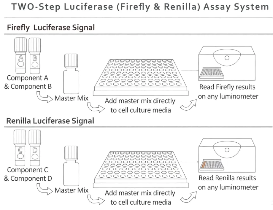 同时现用现配Stop & Glo(Buffer 2),即Renilla Luciferase(海参荧光素酶)的底物,用于终止LARII buffer(Buffer 1)的反应。