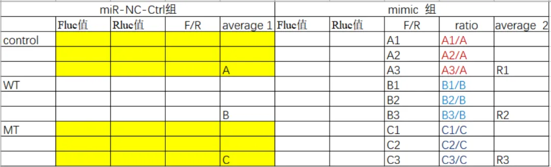 3. 再以miRNA-Ctrl组的average1为标准1进行标准化,即用miRNA mimic组的F/R三个重复值分别除以相对应组别average1得到三个比值
