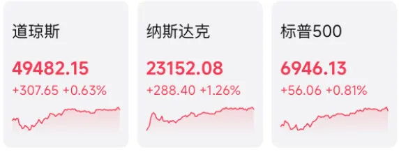 纳斯达克综合指数收涨1.26%,标普500指数收涨0.81%,道琼斯指数收涨0.63%
