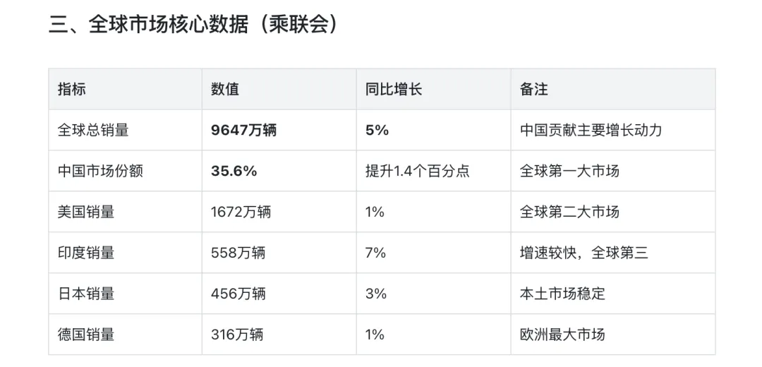 中国总销量3440万辆(中汽协)与3435万辆(乘联会)存在细微差异,属统计口径不同