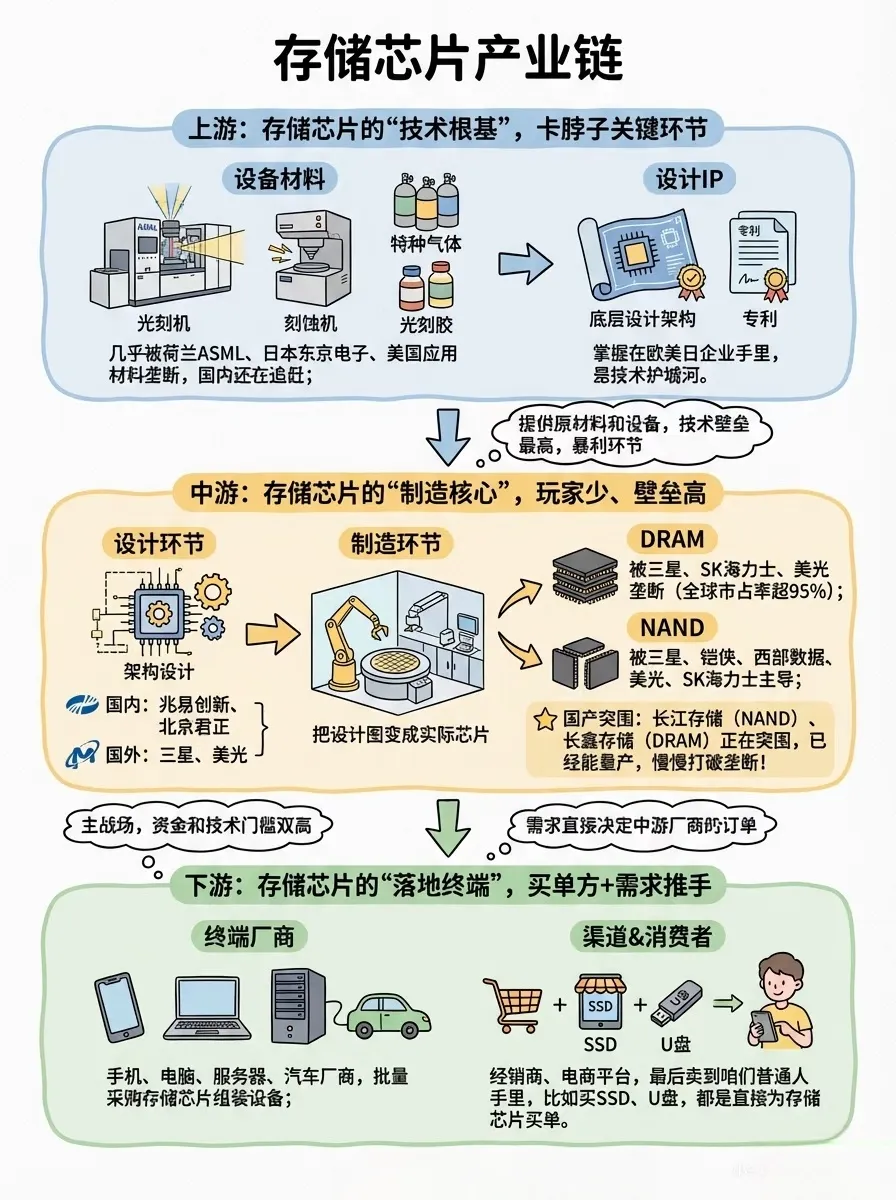 全球存储产业链分为上游(设备、材料、设计IP)、中游(芯片制造、封测、模组)和下游(终端应用)三个环节,各环节价值分布呈现“金字塔结构”,高端技术环节占据核心溢价。2026年,AI需求的爆发推动产业链价值向HBM制造、先进封测、高端主控等环节进一步集中。