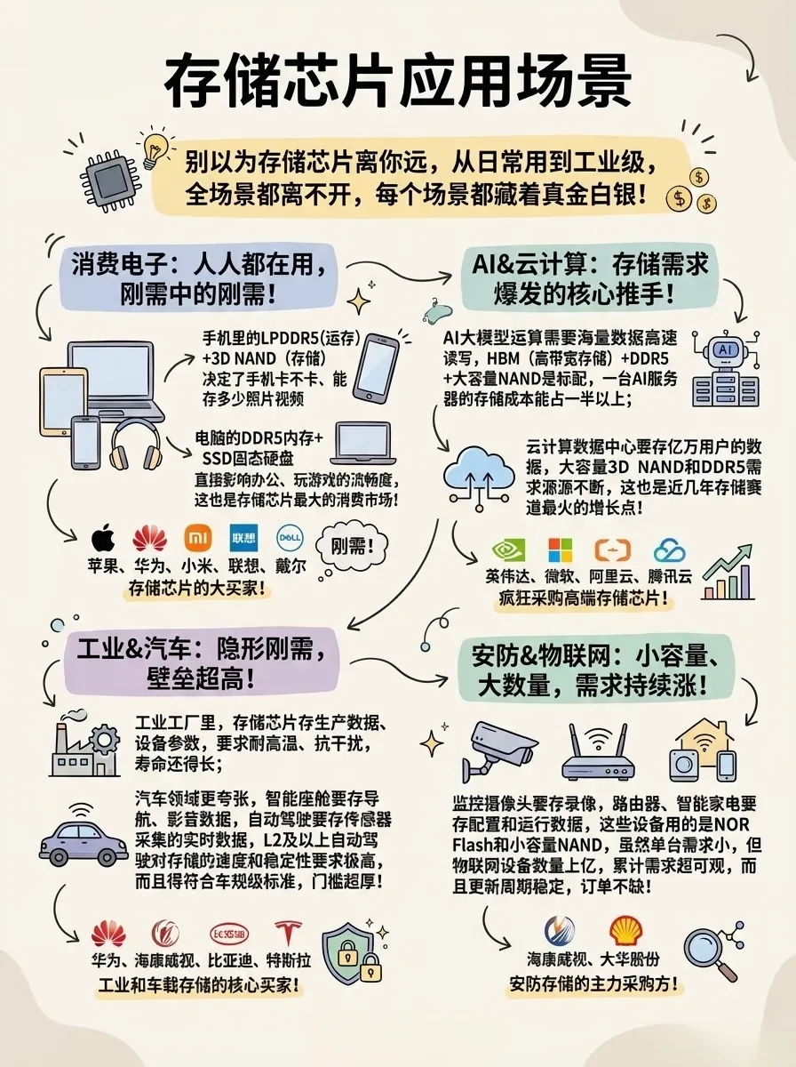 下游应用场景分为AI基础设施、数据中心、消费电子、工业控制、汽车电子五大领域,2026年需求结构发生根本性变化,AI基础设施与数据中心成为核心增长引擎,占全球存储需求的比重从2020年的25%提升至45%。