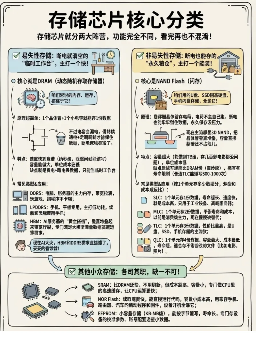 存算一体技术将存储与计算功能融合,打破传统“存储-计算-存储”的数据搬运模式,大幅提升AI推理效率,降低功耗。目前,三星、英特尔、华为等企业均布局存算一体技术,2026年,华为的存算一体芯片将在边缘AI设备实现小规模商用,三星的HBM存算一体方案进入测试阶段。存算一体技术的成熟,将使存储芯片从“配件”升级为AI算力的“核心部件”,重构行业的估值体系。