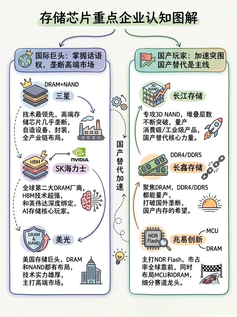 在巨头策略转型的背景下,全球存储产业分层加剧:一是核心客户与中小客户分化,英伟达、苹果、华为等头部企业通过长期合约锁定产能,中小客户只能在现货市场高价抢购零散货源;二是高端与低端市场分化,巨头垄断高端HBM、300层以上3D NAND市场,中国、中国台湾厂商占据中低端消费级、工业级存储市场。