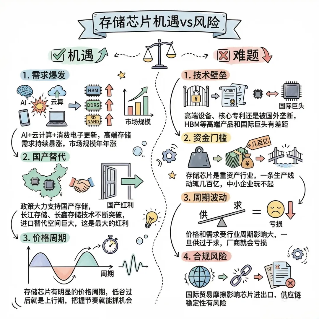 一是高端技术差距风险。国产存储在HBM芯片设计与制造、300层以上3D NAND、高端存储设备等领域,与国际巨头仍存在3-5年的技术差距,高端AI服务器、企业级存储芯片进口依赖度超90%。若技术追赶进度不及预期,可能错失AI存储的市场机遇。