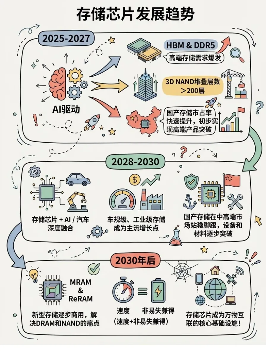 中期(2028-2029年),技术追赶实现高端突破,国产厂商HBM3e/HBM4实现大规模量产,3D NAND堆叠层数突破400层,技术水平比肩国际巨头;全国产化存储产线实现量产,供应链自主可控,高端存储芯片进口依赖度降至50%以下。