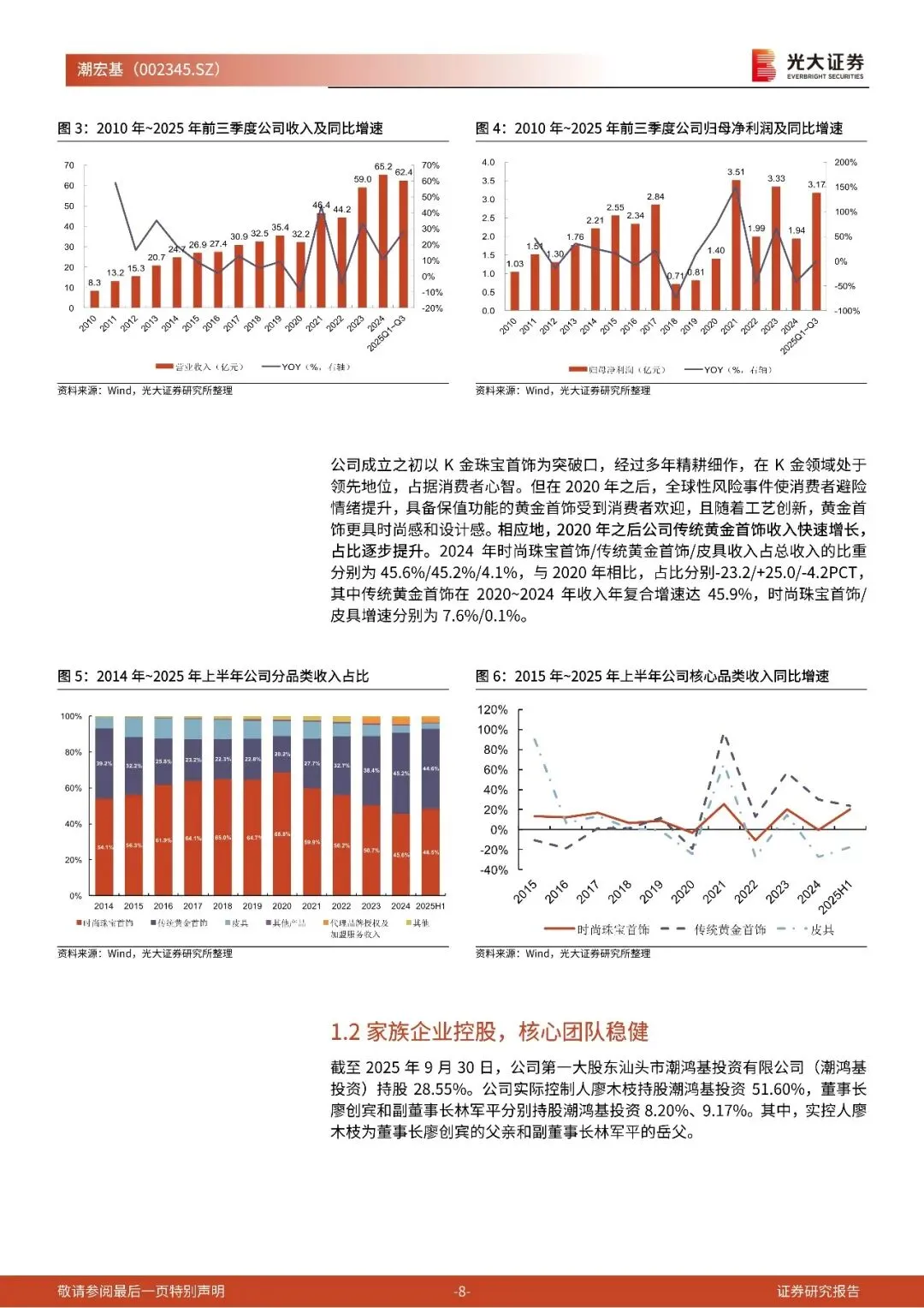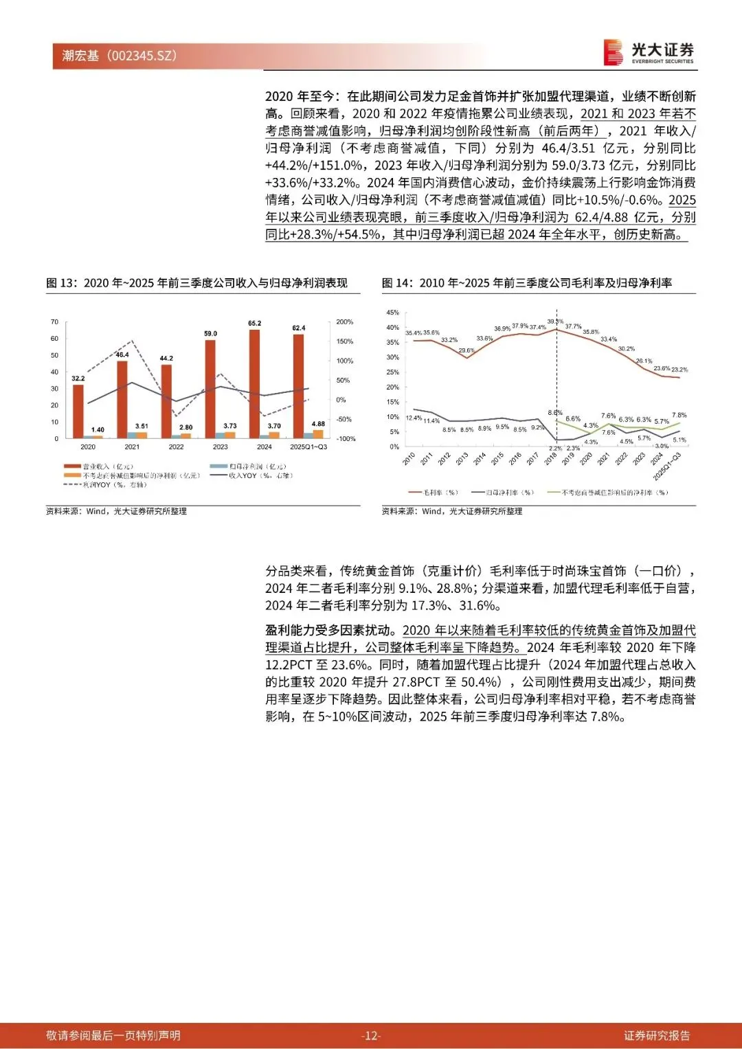 品牌力提升趋势下,足金首饰引领增长,K金占比逐步缩小。成立之初,公司以K金为切入点,在K金珠宝首饰中占据领先地位,而近年来伴随着金价持续上涨、黄金保值需求增加,以及公司品牌力持续提升,公司足金首饰占比提升,K金占比逐渐缩小(2025年K金收入占比已不足5%)。根据业绩预告,2025年全年公司归母净利润预计在4.4~5.3亿元之间,同比增速为125%~175%,扣非归母净利润预计在4.2~5.1亿元之间,同比增速为125%~175%~175%6。