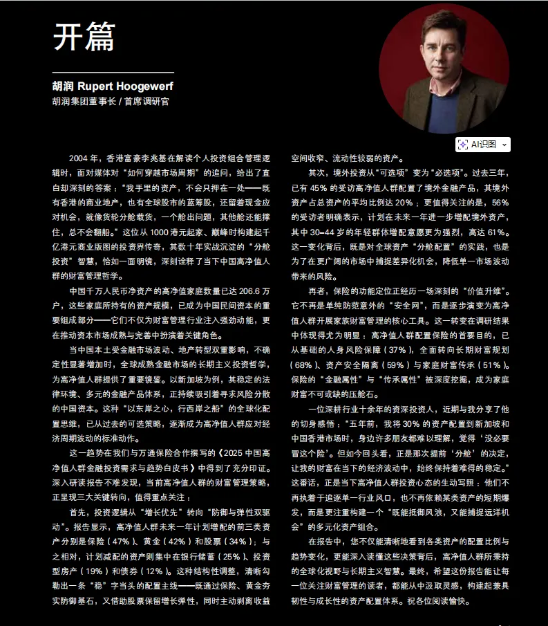 就在最近,我研读了胡润研究院发布的《2025中国高净值人群金融投资需求与趋势白皮书》。这份报告足足对206.6万户中国高净值家庭进行了深度解码,可以说,它就像一面镜子,照出了中国富人阶层在大变局下的真实焦虑与野心。