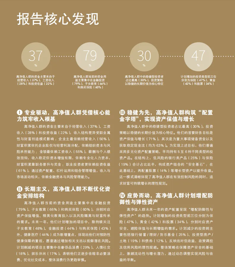 高净值人群在未来一年的资产调整方向上,呈现出“增配防御与弹性资产,减配低收益与高系统性风险资产”的明显趋势。增加保险、黄金和股票,体现了在不确定环境中以保障为本、兼顾流动性与增长机会的配置思路;而减少银行储蓄类产品、投资型房产和债券,则是对低利率、高调控与信用风险环境的理性回应。