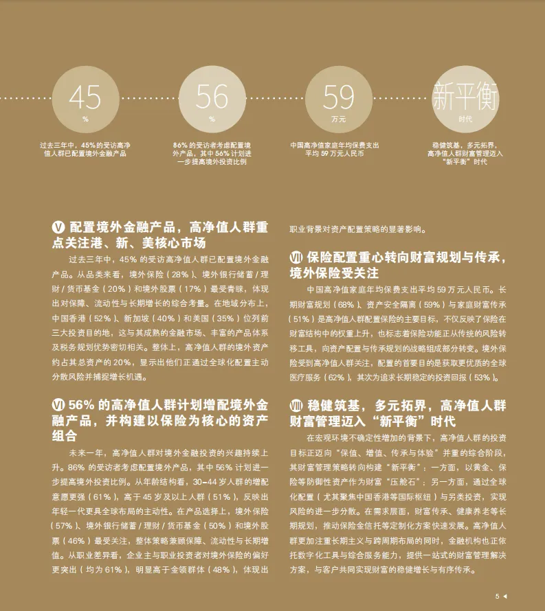 高净值人群对境外保险的偏好可归因于风险分散需求,配置非相关性资产有助于降低整体风险,境外保险作为跨地域、跨币种的保障型资产,能够有效对冲境内市场波动与汇率风险。
