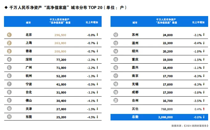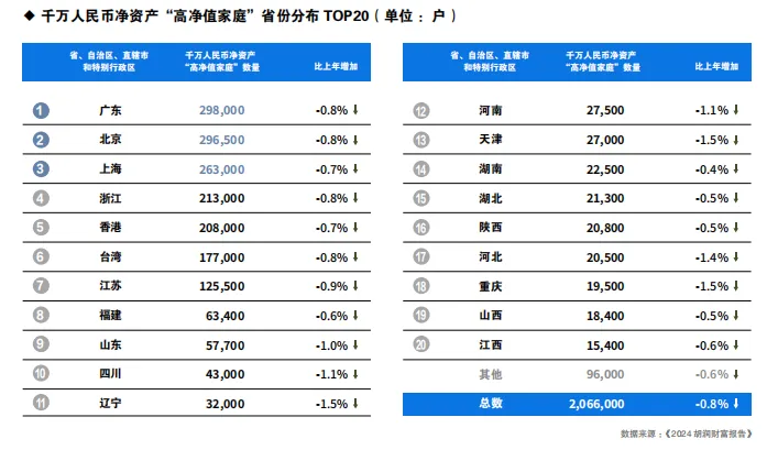 浙江以21.3万户排名第四,同比减少1,800户,拥有千万人民币可投资资产的家庭为10.7万户。香港则以20.8万户位列第五,同比减少1,500户,拥有千万人民币可投资资产的家庭为10.6万户。