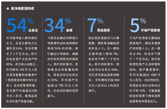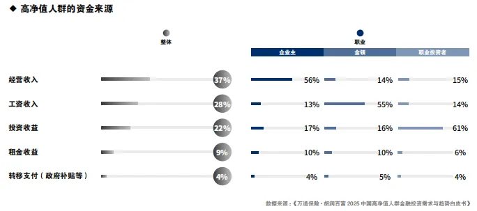 整体上,高净值人群的收入结构差异主要受其职业属性与财富创造模式的影响。三类群体的收入来源差异,反映出其所依赖的核心资本具有异质性:企业主依赖组织资本与风险承担能力,金领依赖专业化人力资本,职业投资者则依赖金融资本与风险管理能力。