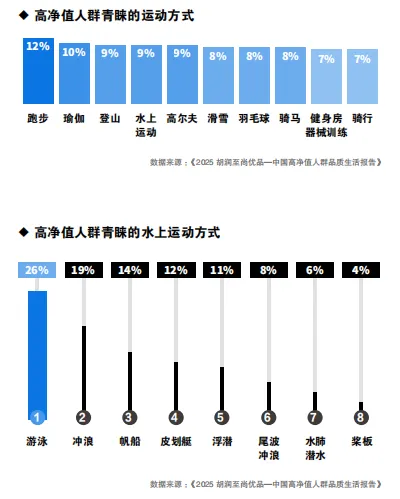 在水上运动中,游泳(26%)遥遥领先。其次,是冲浪(19%)与帆船(14%),这展现出海上运动在高净值人群中的独特吸引力。其他如皮划艇(12%)、浮潜(11%)等也占有稳定群体,说明水上运动形式日趋多样化。
